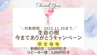 生命の樹「生命の樹セッション今までありがとう」キャンペーン開催します!! さて、突然ですが、ブログのタイトル通り、 「生命の樹セッション今までありがとうキャンペーン」を開催いたします。 (手っ取り早く言うと、割引キャンペーンします♡笑) というのもですね、 早いもので、生命の樹セッションをスタート... 2025.10.21生命の樹